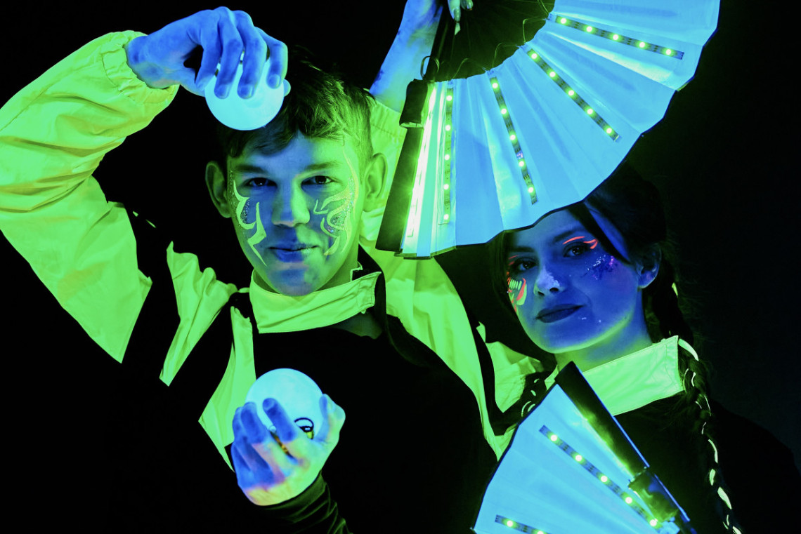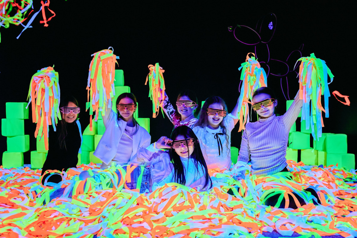 Неонове шоу розпочинається хореографічною композицією зі світловими поями та віялами. Далі на дітей чекає неоновий реквізит, грим, спільні танці, ігри з неоновим парашутом і кубиками та яскрава дискотека з неоновими стрічками.